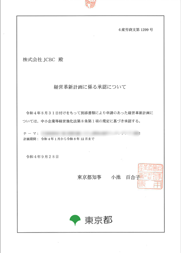 経営革新計画の承認を受け